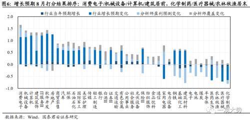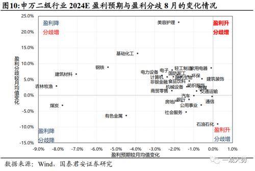 4)分析师盈利预测分歧度:盈利分歧度是衡量行业内是否存在边际变化的指标,盈利分歧扩大,景气边际向上或向下,盈利分歧收敛,边际变化逐步定价充分,预期趋于一致。多数行业在中报季后盈利预期分歧度扩大,盈利预期上调幅度居前且盈利分歧度上升(即存在向上的景气边际)的行业包括:建筑/家电/传媒/消费电子/交通运输/纺织服饰。盈利预期存在向下的边际的行业包括:建材/农林牧渔/电池/半导体/钢铁。