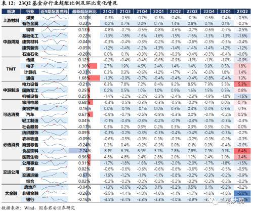 长期拥挤度:从以公募偏股基金的配置情况看,23Q2配置拥挤度(超配比例历史分位)显著缓解的板块包括白酒/美容护理/软件开发/交通运输等,而消费电子/通信/公用事业/医疗器械上升幅度较大。具体来说,23Q2 TMT板块超配比例继续提升,细分行业中硬件赛道如通信超配环比+1.68%,电子+1.30%,但传媒+0.12%,计算机-0.33%,中游制造赛道机械/军工增配幅度亦较明显。除此之外,可选大宗消费板块大幅增配,家电+0.68%,汽车+0.67%,必选消费中医药超配环比亦+0.36%。周期相关板块中仅公用事业超配环比+0.31%。另一方面,二季度减配的行业主要集中于食品饮料(白酒),超配环比-2.74%,其他减配幅度较大的行业包括交运、商贸、非银,周期板块普遍受到一定程度减配,有色、基础化工减配幅度稍大。