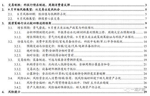 1) 增长预期:中报季后消费/稳定板块盈利预期上调(或下调幅度小)。展望9月,地产数据将成为后续顺周期预期修复斜率的核心线索。科技成长关注产业催化密集的新趋势,包括机器人/消费电子/数据要素/制造业出海/自主可控等。