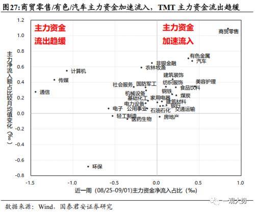主力资金流动:商贸零售/有色/汽车主力资金加速流入,TMT主力资金流出趋缓。主力资金指的是超大单与大单的合计,其在市场中资金实力较强、交易量大、对行情有一定的引导作用,通常是体量较大的机构资金。我们以主力资金流向与趋势跟踪市场中这类投资者的交易行为,辅助判断风险资金偏好。从8月主力资金流向来看,主力资金加速流入的板块包括商贸零售,汽车与有色金属也居前位,TMT的通信、传媒与计算机虽然主力仍流出,但流出速度边际趋缓,环保行业主力资金加速流出,多数行业主力资金成交占比较8月均值水平提升,资金流入加速或流出趋缓。