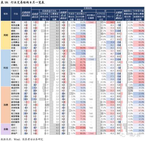 两融资金流入非银/电子/传媒/公用,流出煤炭/钢铁/军工。两融资金代表的是市场中对于风险变化相对敏感的资金,其流入与流出趋势对于判断板块风险评价与风险偏好边际变化具有参考价值。8月两融成交额占比仍然处在近半年低位水平,而从8月份两融资金的流向来看,两融成交额占比持续提升的行业包括非银金融/电子/传媒/公用事业/医药。两融流出相对较大的板块包括煤炭/钢铁/军工。