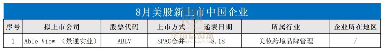 中概股新股发行方面,美妆跨境品牌管理公司ABLE VIEW(景通实业)通过SPAC合并方式登录美股市场,此外并无其他IPO上市的企业。