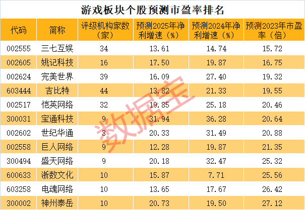 根据机构一致预测今年净利计算,游戏板块中有12只个股预测市盈率不足30倍;其中,吉比特、完美世界、姚记科技、三七互娱等个股预测市盈率不足20倍。成长性来看,盛天网络、世纪华通、宝通科技等个股机构一致预测明年及2025年净利增速均超20%。