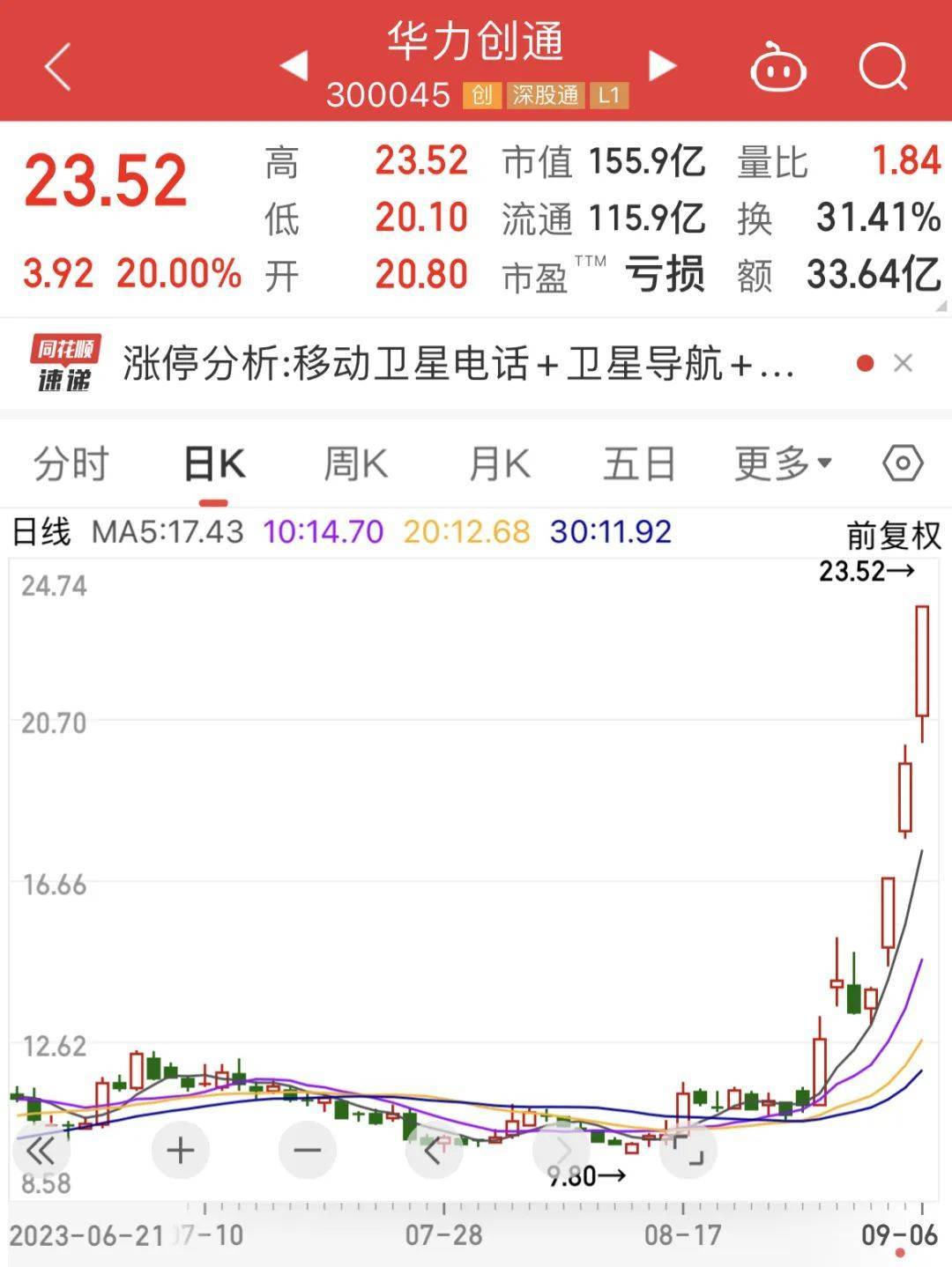 该股拥有众多时下热门题材,包括华为、芯片、卫星互联网等概念。在上述利好消息影响下,该股早盘高开高走,上午收盘20cm涨停。自此,在短短7个交易日,华力创通从11元左右,飙涨至23.52元。