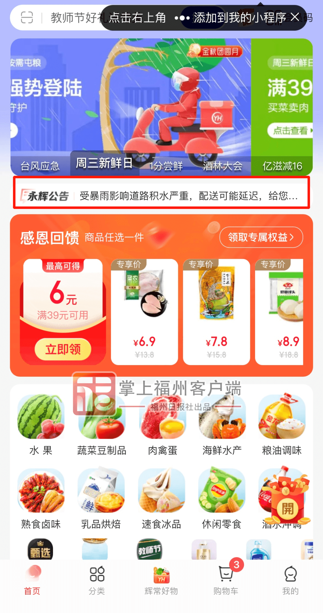 在积极恢复正常营业方面,部分受灾门店快速启动恢复工作,包括排水、疏通下水道、清理门店周围环境等,除福清中环店、公园道店暂停营业外,全省门店基本保持正常营业,同时根据社区及交通情况,灵活调整线上配送围栏,努力保障线上到家服务。