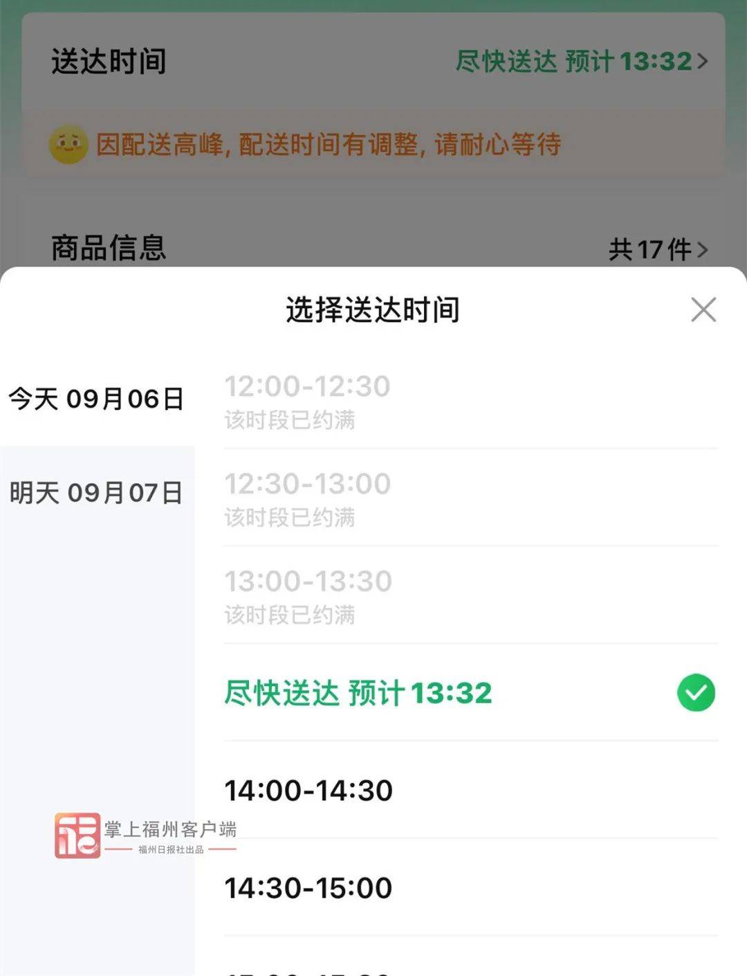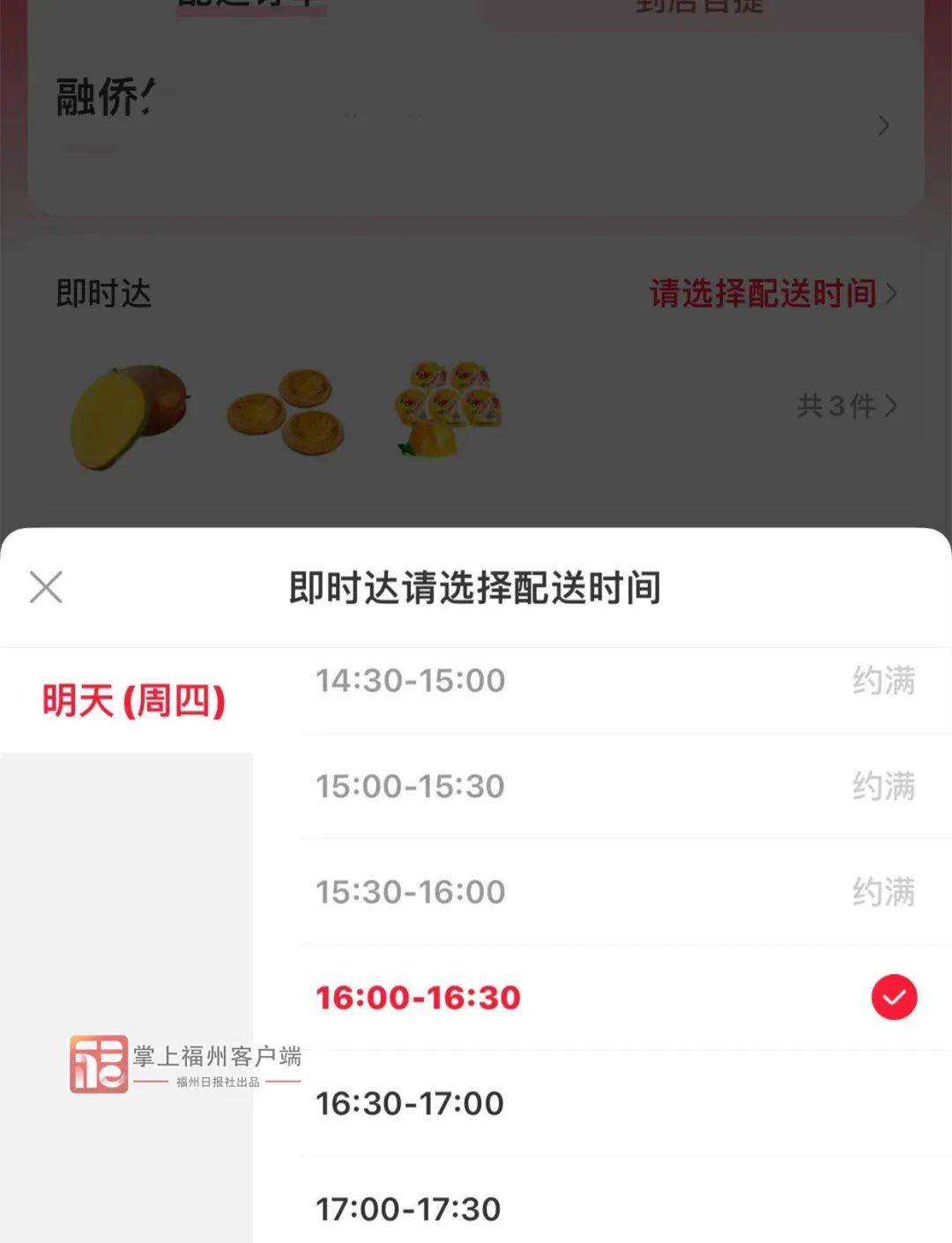 上午11点,位置仓山区,记者分别打开永辉生活app、朴朴app下单,发现永辉生活最快送达时间为下午4:00—4:30;朴朴最快下午1:30送达。