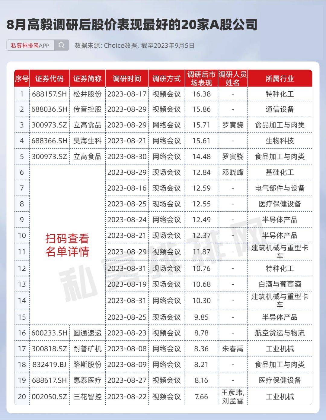 高毅资产8月份调研总次数达116次,半导体、电气部件与设备、西药、食品加工等行业是高毅资产较为关注的行业。其中,松井股份、传音控股、立高食品等公司在被调研后,股价呈上行趋势。