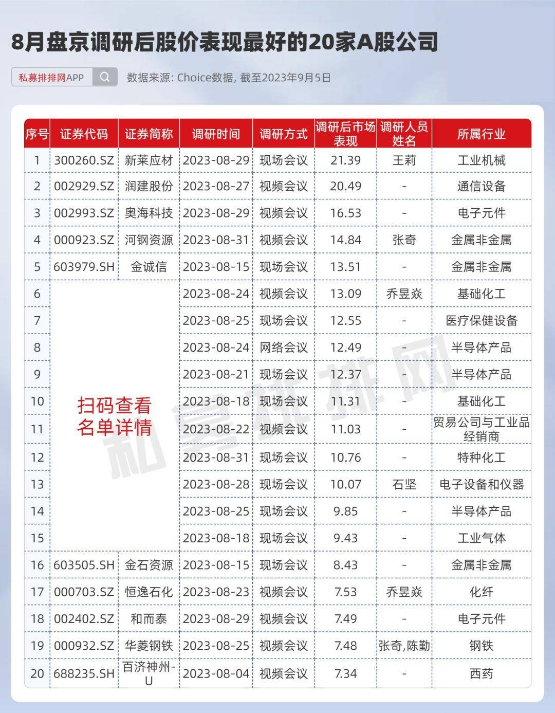 另外,盘京投资8月份调研总次数也达87次,医疗保健、半导体行业是其最为关注的行业,仙琚制药、河钢资源、多氟多是盘京投资关注度最高的个股。而在调研后市场表现较好的个股为新莱应材、润建股份、奥海科技等。