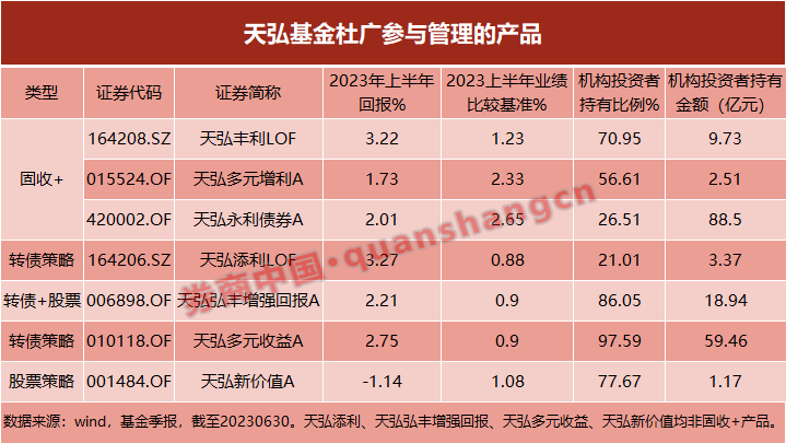 不仅如此,凭借出色的业绩表现,杜广管理的产品被机构大比例持有。最新的中报数据显示,机构持有杜广的产品累计达到了183.67亿元,这在固收+基金经理中并不多见!
