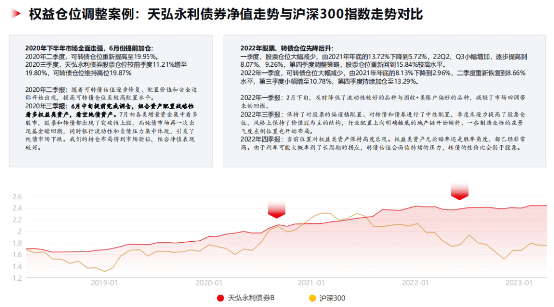 回顾A股行情,2020年下半年从疫情的短暂下挫中回复后,市场全面走强,定期报告显示,天弘永利债券提前预判并选择在6月份加仓:二季度,可转债仓位重新提高至19.95%。,三季度更是将股票仓位较前季度11.21%增至19.80%,可转债仓位维持高位19.87% ,并看空纯债资产。
