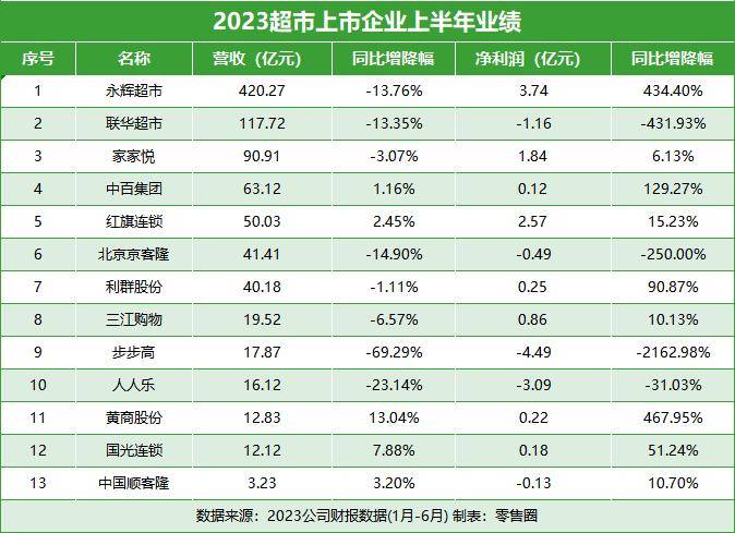 《零售圈》了解到,在永辉、中百、家家悦、联华等13家超市上市企业发布的半年报中,除中百、红旗、黄商、国光4家企业实现了营收净利双增长外,其他9家企业均出现了营收或净利的下滑,占比超六成。