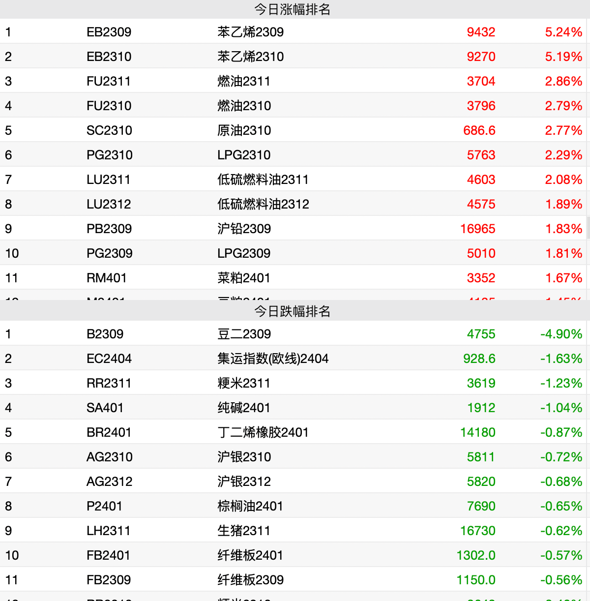 9月6日消息,商品期货收盘多数上涨,能化系领涨,苯乙烯涨超5%,燃油、原油、液化石油气等涨超2%,沪铅、菜粕、豆粕、工业硅等涨超1%;集运指数(欧线)、梗米、纯碱等跌超1%。
