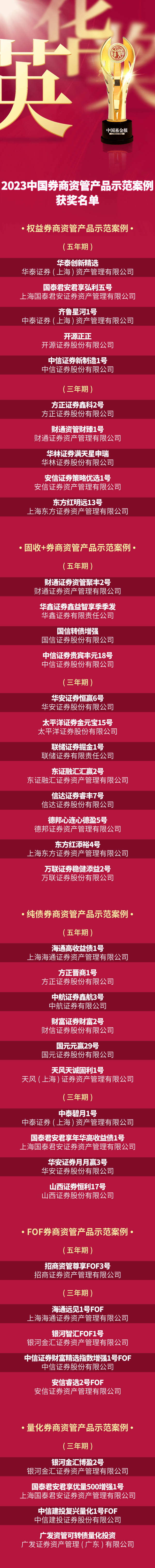 同时,6家券商获评权益类券商资管示范机构、7家券商获评固收类券商资管示范机构、3家券商获评量化类券商资管示范机构;41只各类券商资管产品,获评券商资管产品示范案例。