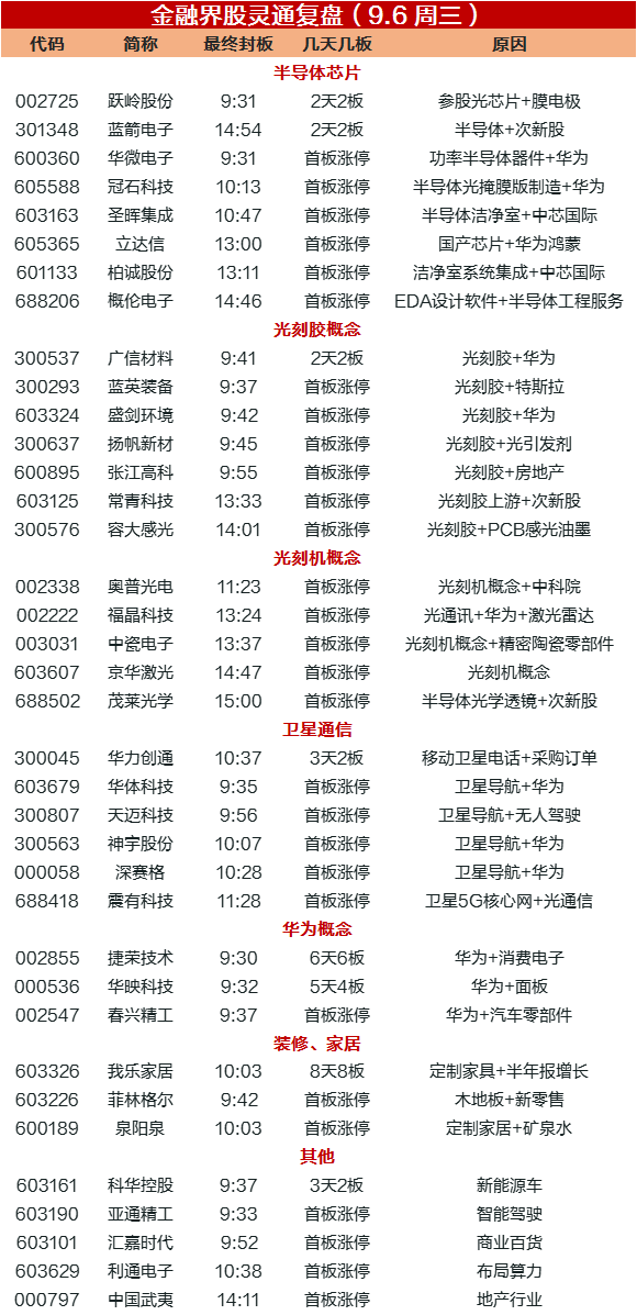 9月6日周三,A股共37股涨停(不含ST股),16股封板未遂,连板股总数6只,我乐家居(家居+业绩增长)8连板,捷荣技术(华为概念)6连板,华映科技(华为概念)3连板,跃岭股份(国产芯片)、广信材料(光刻机+光伏用胶+华为概念)、蓝箭电子(国产芯片)2连板。