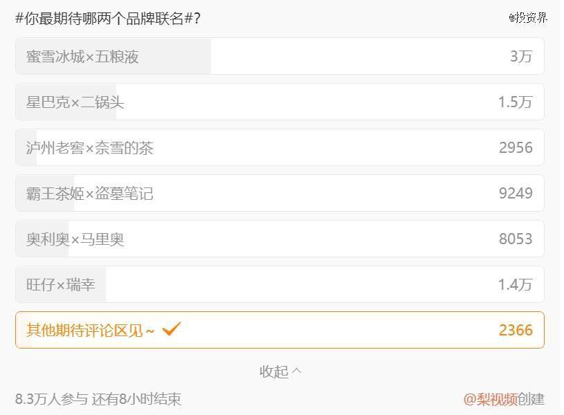 然而大家对辟谣并不买账,反而纷纷催促双方达成合作:“这泼天的富贵,小雪和五粮液还在等什么?”甚至有人提议,让蜜雪冰城干脆跟老干妈联动,来个柠檬辣椒水。一些脑洞更大的合作方案出炉星巴克x二锅头、泸州老窖x奈雪的茶、霸王茶姬x盗墓笔记……