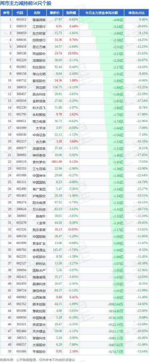 9月6日两市主力卖出的前50只股