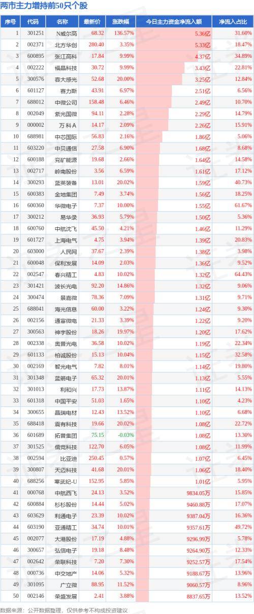 9月6日两市主力买入的前50只股
