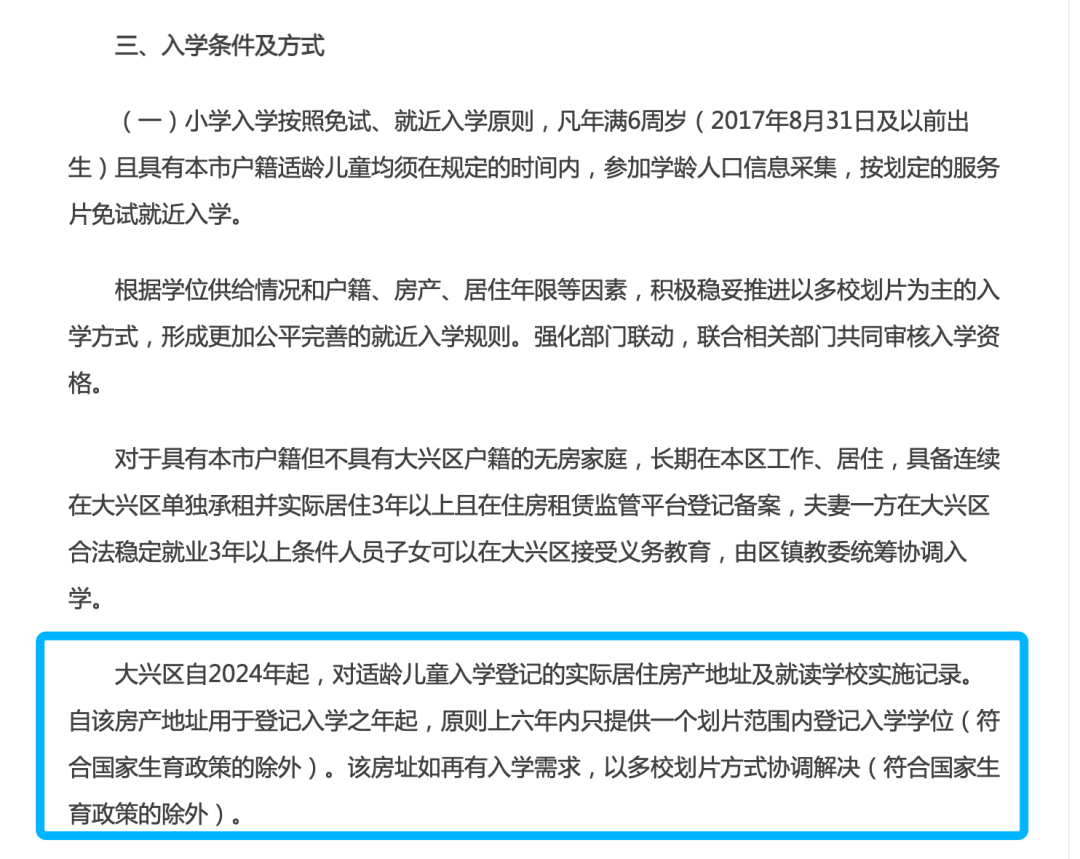大兴区在《北京市大兴区教育委员会关于2023年义务教育阶段入学工作意见》中明确,大兴区自2024年起,对适龄儿童入学登记的实际居住房产地址及就读学校实施记录。自该房产地址用于登记入学之年起,原则上六年内只提供一个划片范围内登记入学学位(符合国家生育政策的除外)。该房址如再有入学需求,以多校划片方式协调解决(符合国家生育政策的除外)。