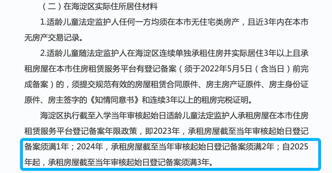 海淀区在《2023年本市其他区户籍无房家庭适龄儿童在海淀区接受义务教育材料审核细则》中提及,2024年幼升小海淀区京籍无房非户籍区租房入学需要租房备案满2年,2025年起满3年。