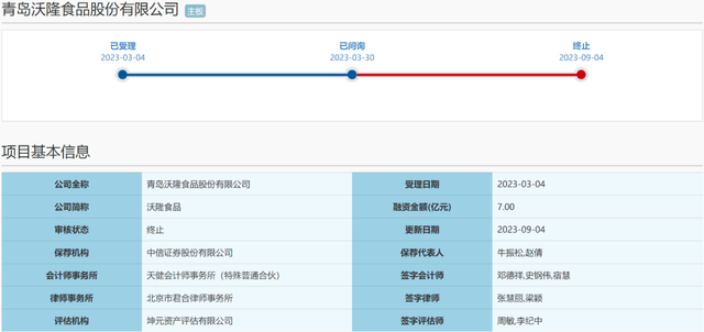 9月4日, 上交所官网信息显示, 沃隆食品在主板的IPO申请,因保荐机构单方面撤回申请材料,该IPO申请被上交所终止。