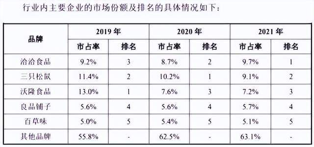 从市占率排名来看,2019年沃隆食品尚处于行业首位,之后其市场份额连续两年下滑,2020年就跌到了第3名,到2021年,仅占比7.2%,稳居行业第三。
