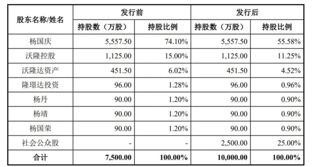 招股书显示,公司的控股股东、实际控制人为杨国庆,现任公司董事长兼总经理,其直接持有公司 5,557.50 万股,占比 74.10%,通过沃隆控股间接控制公司 1,125.00 万股,占比 15.00%,合计控制公司 6,682.50 万股,占比 89.10%。