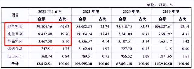 虽然看上去似乎占比在逐年下降,但如果放大来看,只是混合坚果换个包装、分个类,变成礼盒坚果和单品坚果,其实整个“坚果”类产品占比高达98%,结构非常单一。