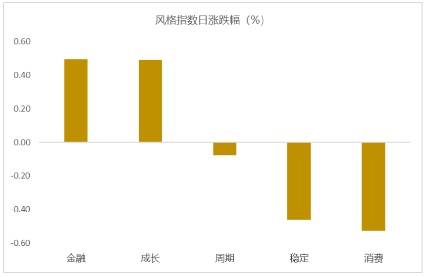 从风格指数上来看,今日多数风格均表现不错,其中金融和成长风格的个股涨幅最大,消费风格的个股表现最弱。近期风格转换较为明显。