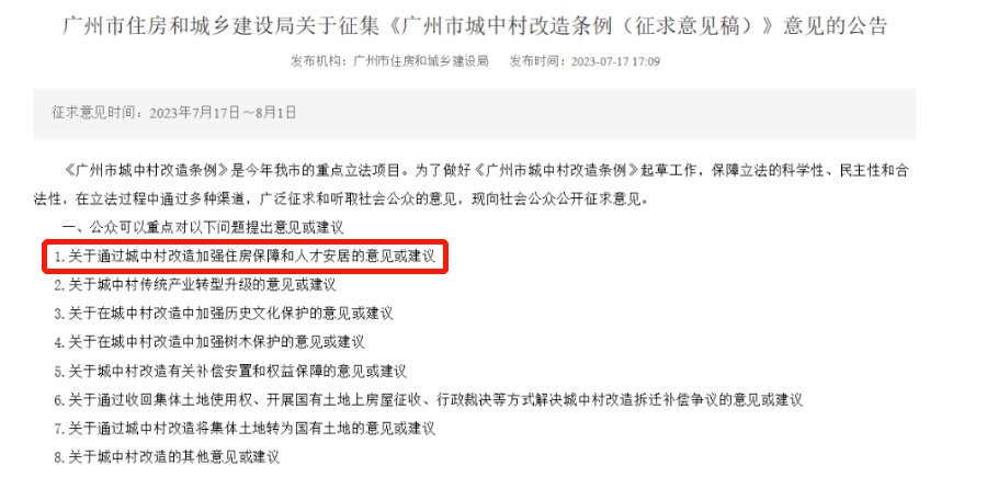 像广州在征集意见的城中村改造条例,放在首位的,就是“通过城中村改造加强住房保障和人才安居”