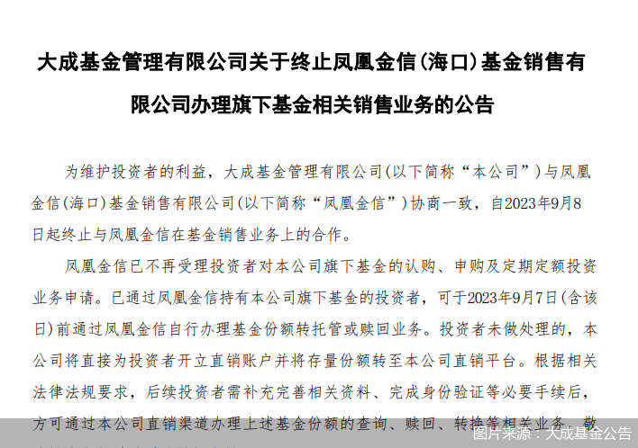 又有公募与代销机构“分手”。9月6日,大成、宝盈基金均发布公告表示,为维护投资者利益,与凤凰金信协商一致,终止与其在基金销售业务上的合作。