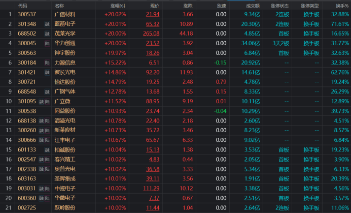 今日(9月6日),半导体芯片概念股再度活跃,截至收盘,累计共有20余股涨停或涨幅超10%。其中,广信材料、蓝箭电子、茂莱光学、华力创通、神宇股份、均获20cm涨停,且广信材料、蓝箭电子双双晋级2连板,华力创通也录得3天2板。