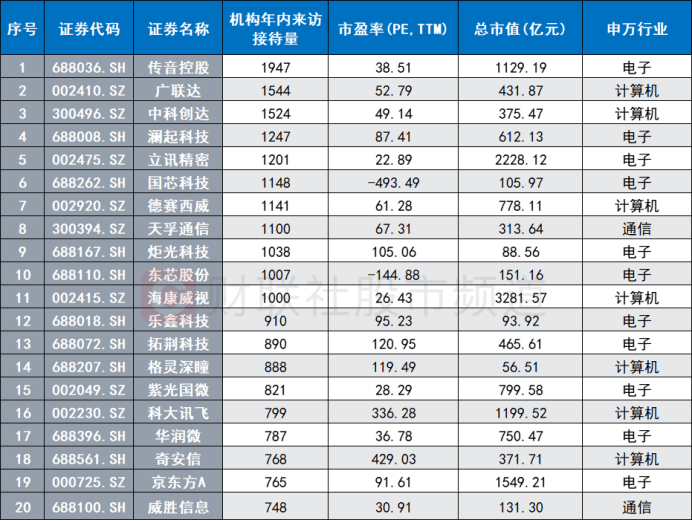 注:年内机构调研量居前的电子、通信、计算机股(截至发稿时)