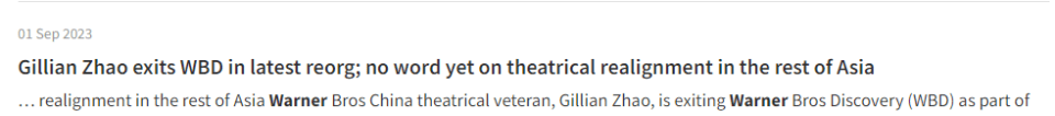 根据9月1日ContentAsia Insider媒体权威报道,华纳兄弟探索集团亚太地区组织架构进行重组,其中引人注目的是中国区总裁赵方将从其职位离任并即日起进入休假状态。