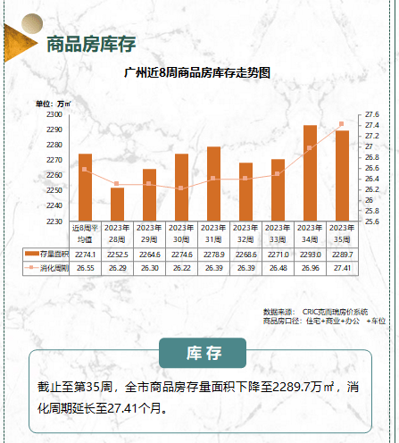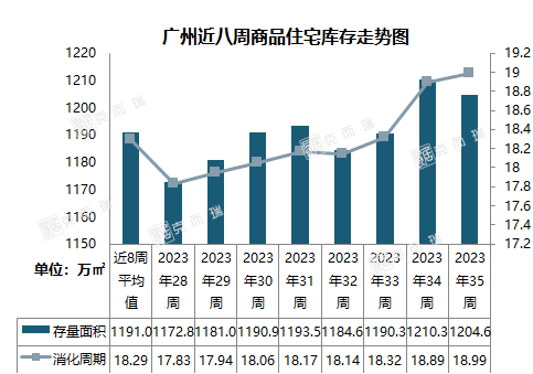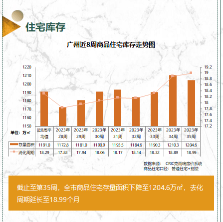 截止至第35周,全市商品住宅存量面积下降至1204.6万㎡,去化周期延长至18.99个月。