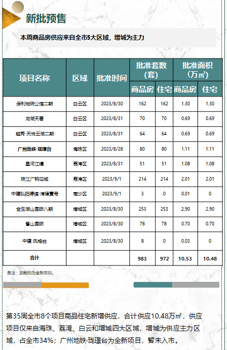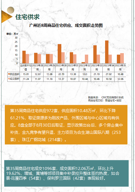 第35周商品住宅供应972套,供应面积10.48万㎡,环比下降61.21%,取证房源多为刚改产品,外围区域与中心区域均有供应。
