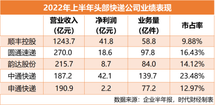 据时代财经统计,上半年,除韵达股份外,快递公司在业务量上均跑出了双位数的增速。