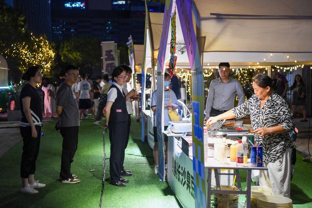 8月25日,市民游客在南京市建邺区西城·夜未央街区排队购买小吃。新华社记者李博 摄