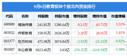 北向资金方面,当日教育板块北向资金持股市值为3.67亿元,减持0.16亿元。其中增持最多的是博瑞传播,增持了43.71万元。减持持最多的是中公教育,减持了0.16亿元。教育板块北向资金持股变动明细见下表:
