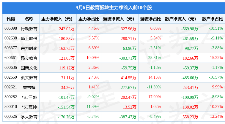从资金流向上来看,当日教育板块主力资金净流出1.4亿元,游资资金净流入3291.09万元,散户资金净流入1.07亿元。教育板块个股资金流向见下表: