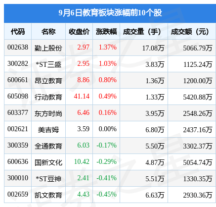 9月6日教育板块较上一交易日下跌0.98%,开元教育领跌。当日上证指数报收于3158.08,上涨0.12%。深证成指报收于10515.21,下跌0.24%。教育板块个股涨跌见下表: