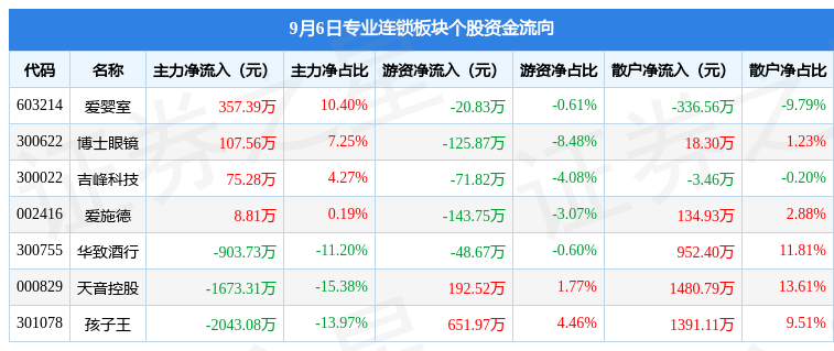 从资金流向上来看,当日专业连锁板块主力资金净流出4071.08万元,游资资金净流入433.56万元,散户资金净流入3637.52万元。专业连锁板块个股资金流向见下表: