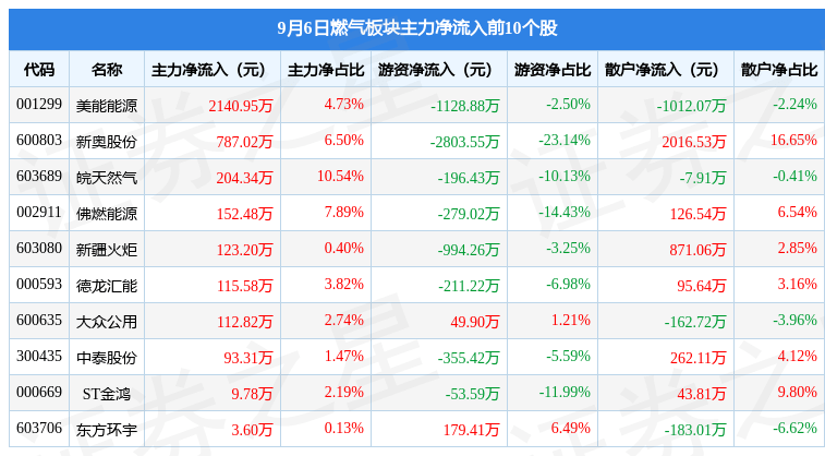 从资金流向上来看,当日燃气板块主力资金净流出3280.53万元,游资资金净流出6295.2万元,散户资金净流入9575.72万元。燃气板块个股资金流向见下表:
