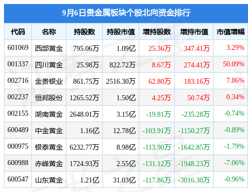 9月6日贵金属板块较上一交易日下跌1.11%,赤峰黄金领跌。当日上证指数报收于3158.08,上涨0.12%。深证成指报收于10515.21,下跌0.24%。贵金属板块个股涨跌见下表: