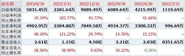 最近三年,公司的营收分别为3.23亿元、4.11亿元和4.50亿元,上年的营收增速为9.63%。对应的扣非净利润分别为4269万元、6050万元和7849万元,上年的增速为29.74%。公司预计2023三季度营收比同比增长23.09%至28.38%,净利润同比增长27.76%至32.19%,扣非净利润同比增长47.94%至54.02%。