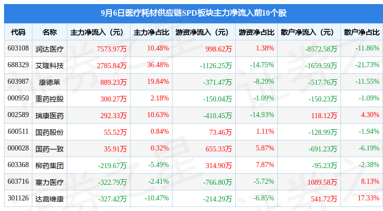 从资金流向上来看,当日医疗耗材供应链SPD板块主力资金净流出1962.06万元,游资资金净流出3244.21万元,散户资金净流入5206.27万元。医疗耗材供应链SPD板块个股资金流向见下表: