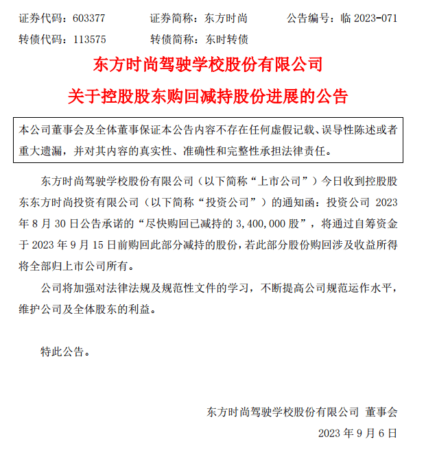 9月6日盘后,东方时尚公告显示,东方时尚收到控股股东东方时尚投资有限公司(以下简称“投资公司”)的通知函:投资公司 2023年8月30日公告承诺的“尽快购回已减持的 3,400,000 股”,将通过自筹资金于2023年9月15日前购回此部分减持的股份,若此部分股份购回涉及收益所得将全部归上市公司所有。公司将加强对法律法规及规范性文件的学习,不断提高公司规范运作水平, 维护公司及全体股东的利益。