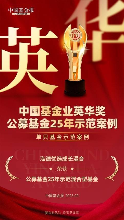 2023年9月6日,由《中国基金报》主办的“2023中国机构投资者论坛暨基金业25周年盛典”在北京成功举行。“中国基金业英华奖公募基金25年示范案例”评选结果也正式揭晓,泓德基金本次共荣获5个奖项,公司旗下泓德优选成长混合获评“公募基金25年示范混合型基金”。