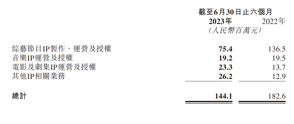 从结果来看,星空华文这些IP都面临“老化”的问题,在创造收入上也就难以避免地出现下滑。今年上半年,综艺节目IP制作、运营及授权收入约为7538.7万元,与上年同期的1.36亿元相比,下降44.8%。这项业务约占总营收的52%,下滑主要由于综艺节目数量较同期有所减少。与主营业务相关联的音乐IP运营及授权收入1923万元,比去年同期的1950万元有所下降。
