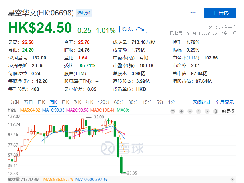 星空华文随之跌至谷底。上周五,好声音制作方星空华文股价再度下跌13.3%,盘中创造了历史新低。