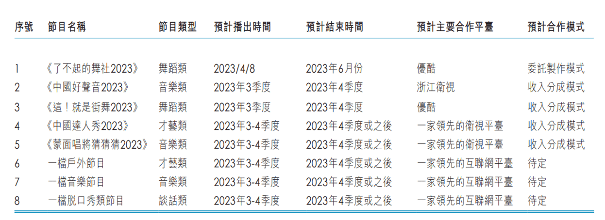 在2022年年报中,星空华文就曾表示今年将推出8档节目,包括《了不起的舞社2023》《中国好声音2023》《这!就是街舞2023》《中国达人秀2023》以及《蒙面唱将猜猜猜2023》。